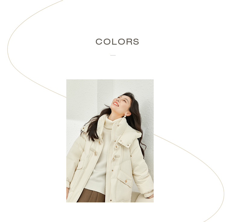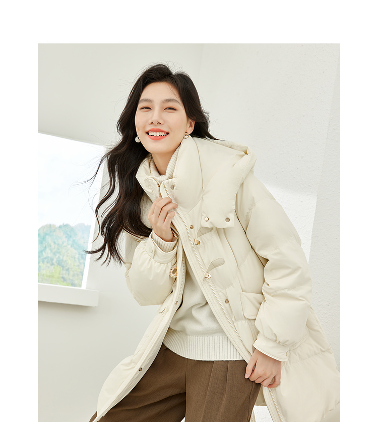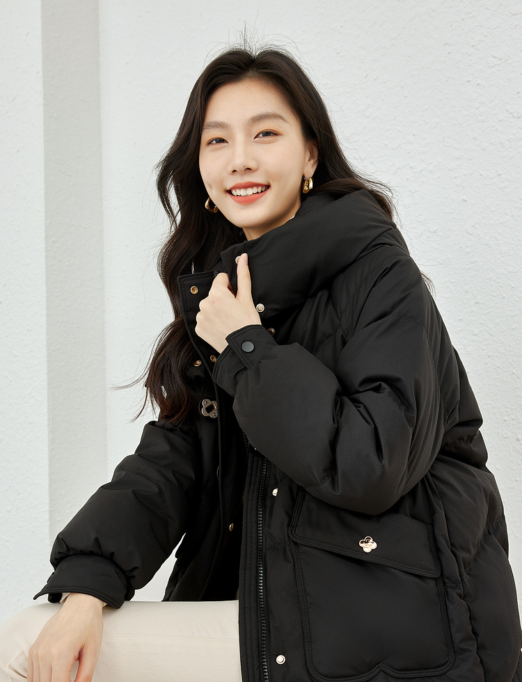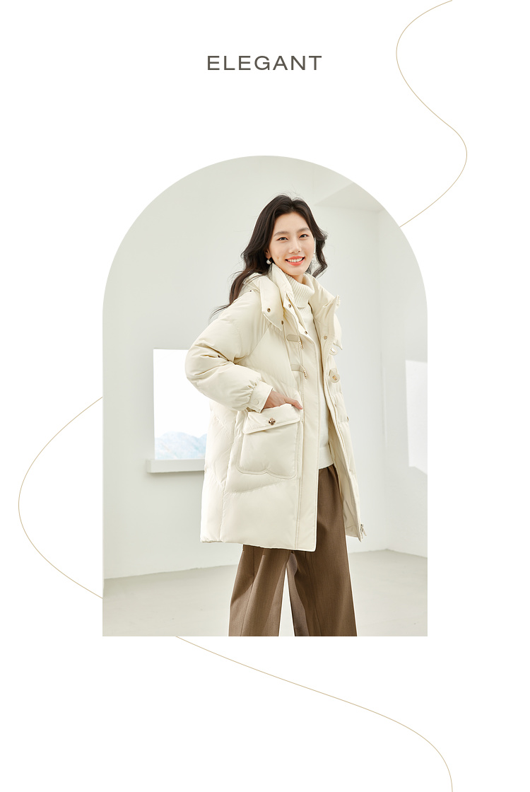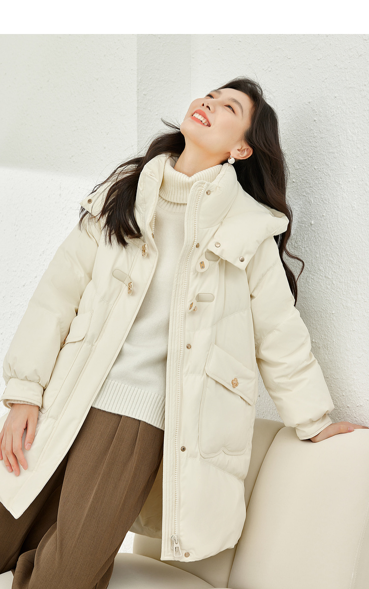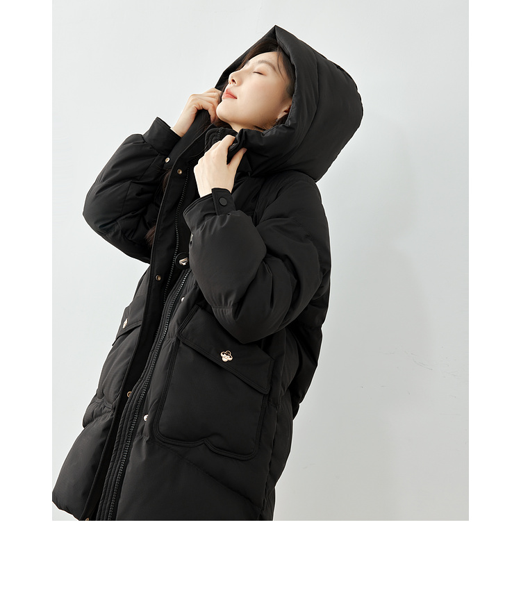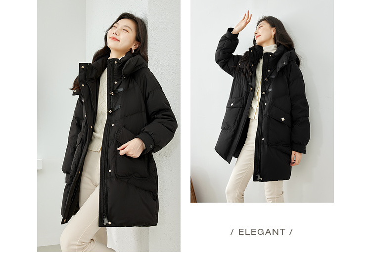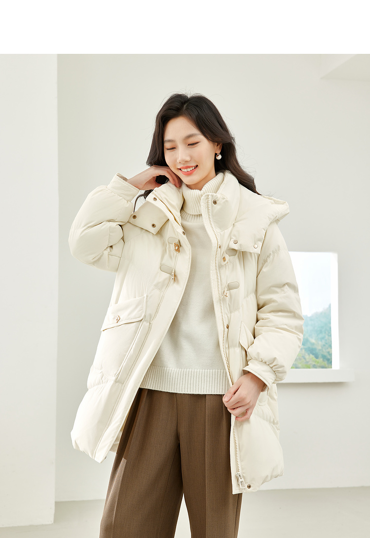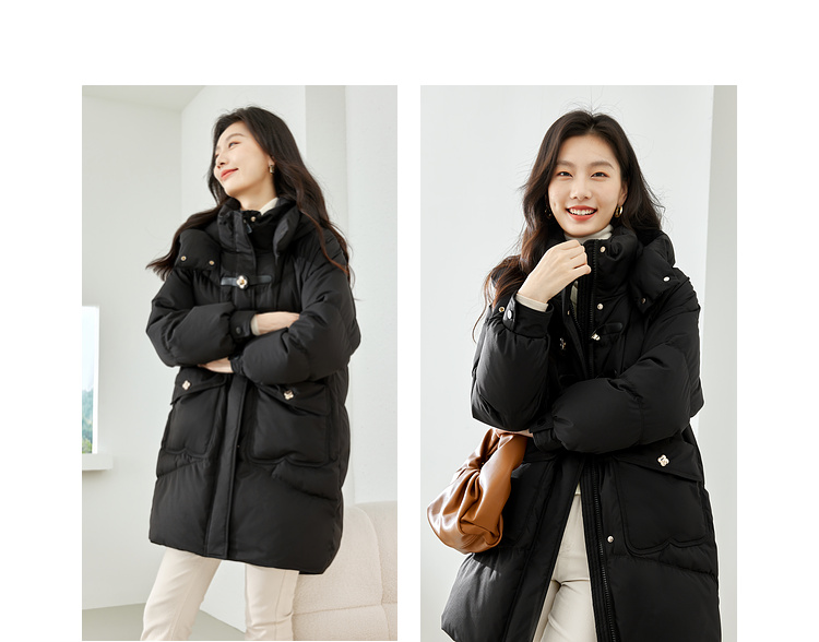 Thick fabric, white duck down filling, hooded stand collar, with pockets